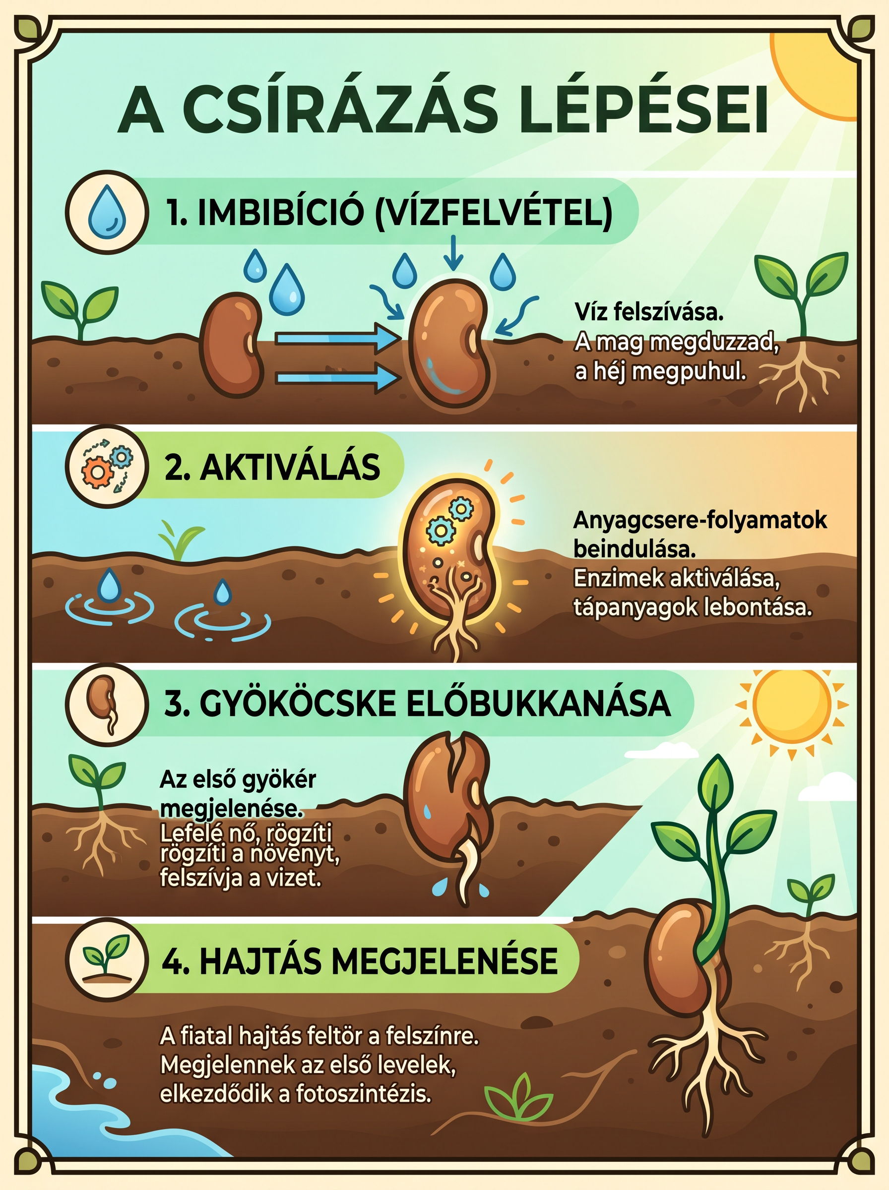 A mag megszívja magát vízzel (ezt hívják imbibíciónak), az enzimek aktiválódnak, és megkezdik a raktározott tápanyagok lebontását. Ebből az energiából táplálkozik az embrió – tehát maga a kis csíra – anélkül, hogy egyetlen foton napfényt kellene elkapnia.